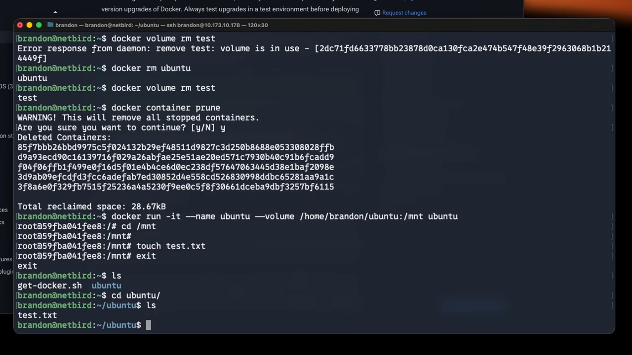 In this case, the volume is in use. You can see the last few containers if you list all stopped containers. The volume is associated with the Ubuntu container, so the volume must be removed first. You can remove a single container with , or remove all stopped containers with a prune command: