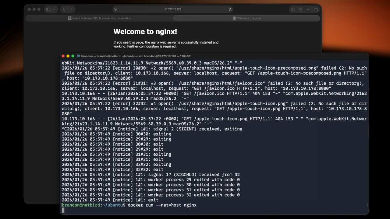 In this case, nginx will bind directly to port 80 on the host, so it should be reachable from a web browser just by typing "localhost" or the host machine's IP address.