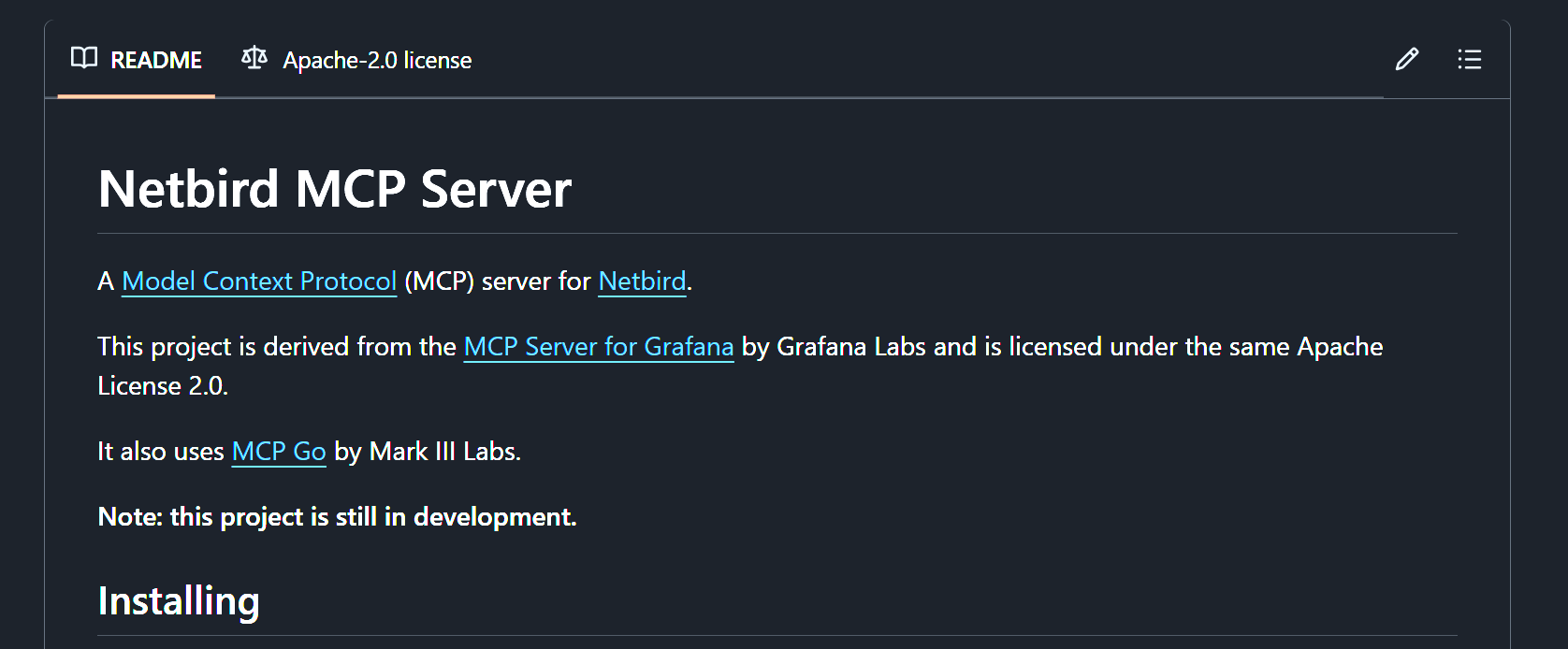 This tool provides read-only access to NetBird resources such as peers, groups, policies, and networks, facilitating enhanced observability and automation. It's particularly beneficial for users aiming to incorporate NetBird insights into their AI-driven workflows.